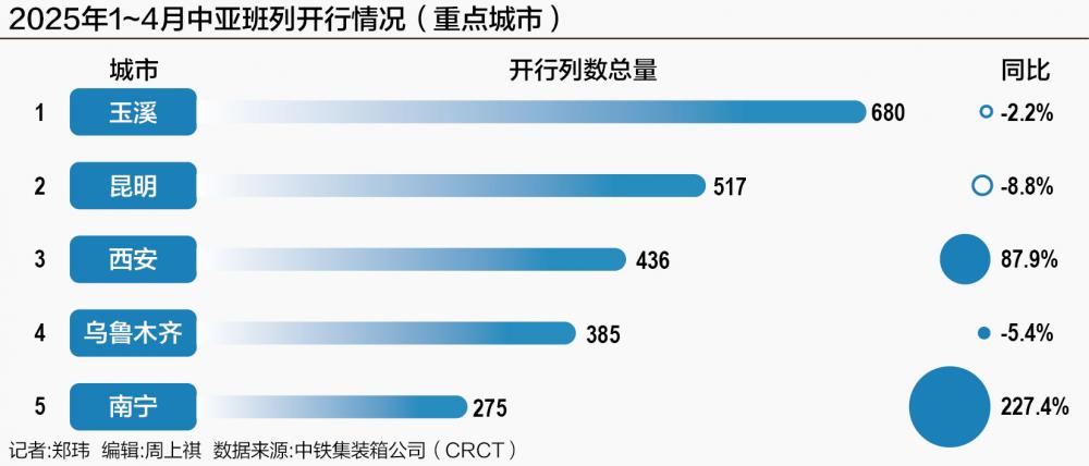 中国(深圳)综合开发研究院物流与供应链研究所所长王国文认为,今年1~3月中欧班列开行量下降或受地缘政治影响,导致中欧班列通行效率下降,部分出口需求被分流至中亚五国通过多式联运中转至欧洲,也在一定程度上带动中亚班列开行量增长,未来随着全球贸易市场布局重构,跨境铁路作为链接“一带一路”共建国家市场的“第三渠道”将发挥更加关键的作用。