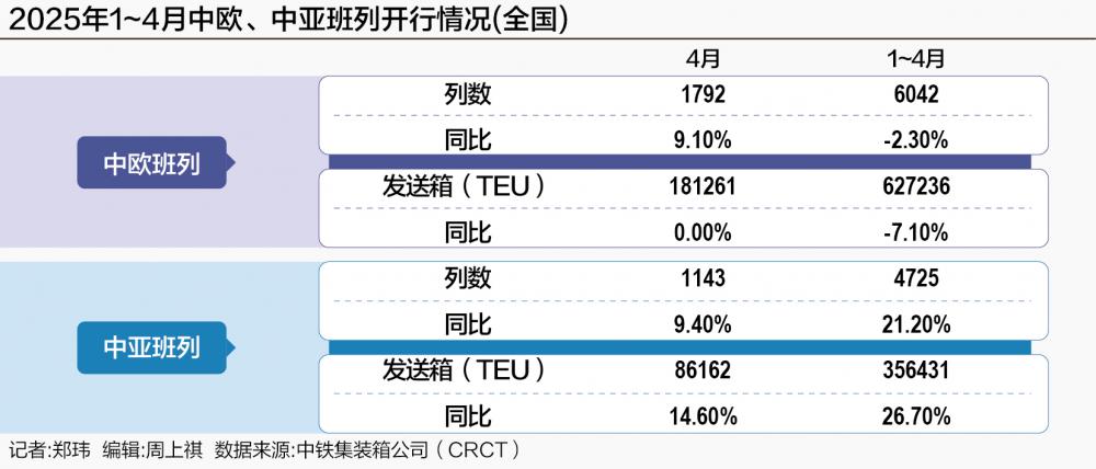 同样是2025年1、2、3月,中亚班列的开行列数及发送集装箱总量同比均实现双位数的高速增长,其中开行列数增幅分别达到20.60%、20.20%、34.90%,发送集装箱总量增幅分别达到24.40%、28.60%、40.10%。4月,中亚班列开行列数同比增幅也仍然保持在9.4%的高位,发送集装箱总量同比增长14.60%。今年以来,中亚班列持续“狂飙”。