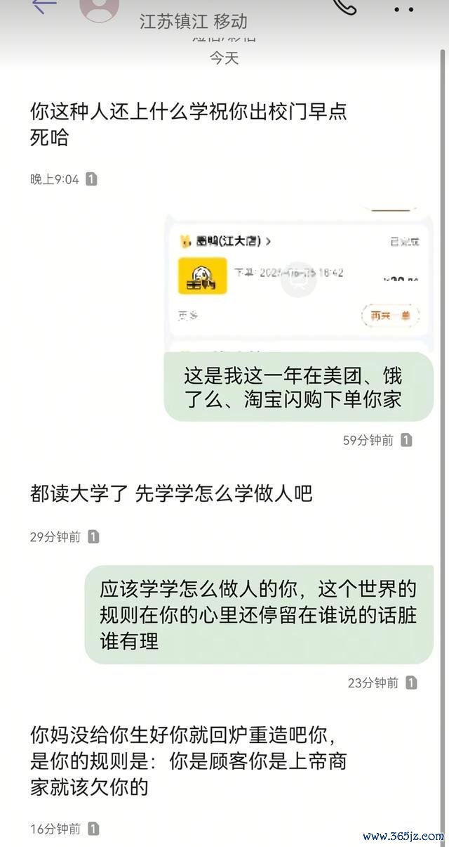 在帖文中,当事大学生还晒出了自己的订单截图,显示其购买了4串卤鸭板肠、猪手半只、贡菜1串、鸭翅1个,以及一个打包盒,上面备注“加热加热,要保温袋谢谢老板”。帖文中,还贴出了双方的短信对话截图,对方在短信中不仅辱骂“祝你出校门早点死”,还有“你妈没给你生好你就回炉重造”等言语。根据当事大学生的帖文,涉事店铺为墨鸭黑鸭王镇江江苏大学店。