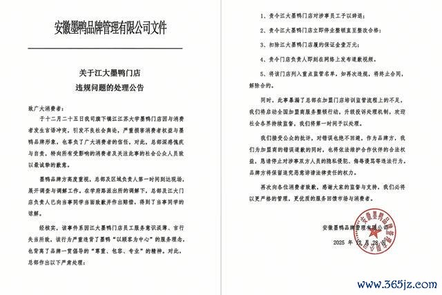 12月28日,安徽墨鸭品牌管理有限公司在官方账号发布了“关于江大墨鸭门店违规问题的处理公告”,公告中称,12月25日,该司旗下镇江江苏大学墨鸭门店与消费者发生言语冲突,在学府路派出所的调解下,总部及江大门店负责人已向当事同学当面致歉并作出赔偿,得到了当事同学的谅解。总部也责令该门店作出辞退涉事员工、停业整顿、门店负责人在网络上道歉等处理。