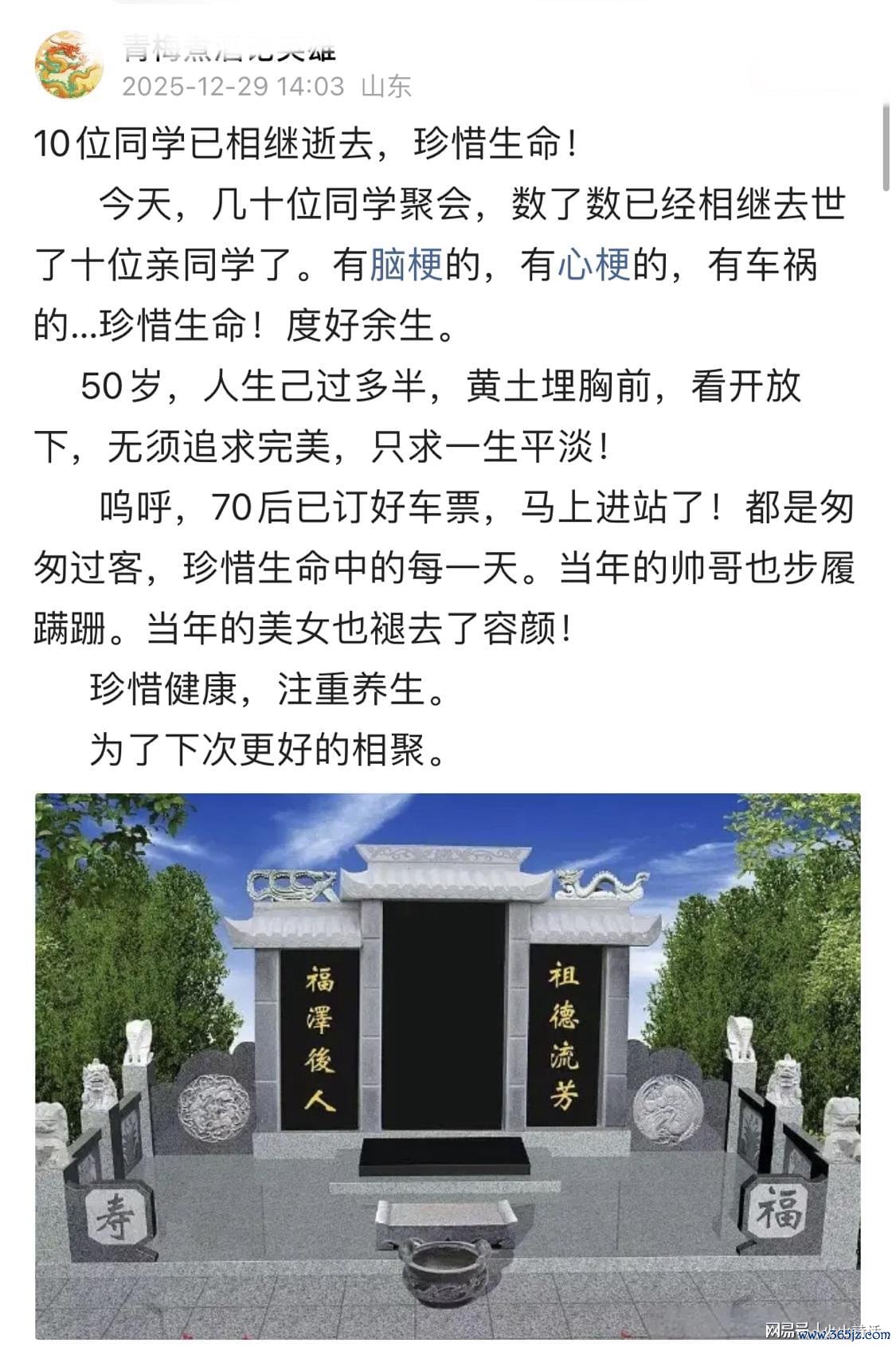 今天,几十位同学聚会,数了数已经相继去世了十位亲同学了。有脑梗的,有心梗的,有车祸的…珍惜生命!度好余生。50岁,人生已过多半,黄土埋胸前,看开放下,无须追求完美,只求一生平淡!