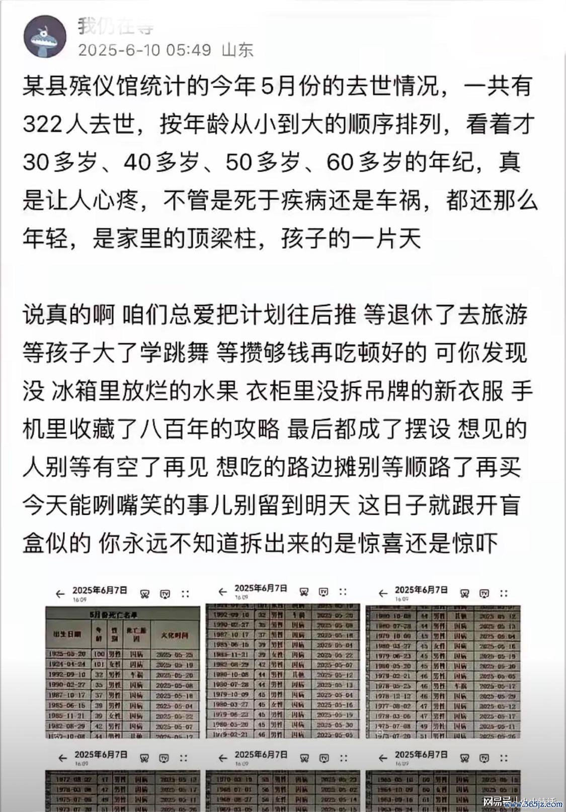 5月短短一个月,322人永远离开,60岁以下的占了足足31%,男性更是占了69%。看着上面的年龄数字——37岁、45岁、58岁,哪一个不是正扛着家的人?可能前一天还在为了房贷加班到深夜,为了孩子学费跑遍市场,转天就成了清单上的一行字。
