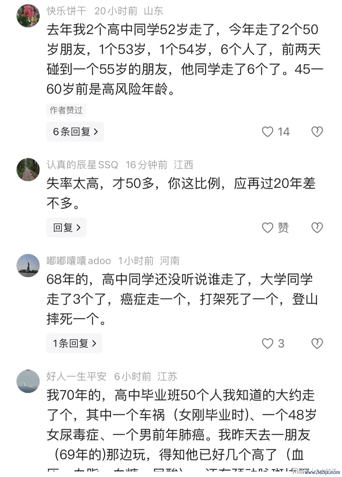 此帖一发,迅速引发网友热议。有网友表示,去年我2个高中同学52岁走了,今年走了2个50岁朋友,1个53岁,1个54岁,6个人了,前两天碰到一个55岁的朋友,他同学走了6个了。45一60岁前是高风险年龄。